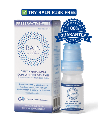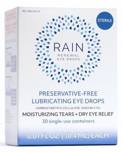 RAIN™ eye drops are completely preservative-free and with ZERO harsh chemicals or redness removers to simply hide dry eye problems. With science-backed results, RAIN™ moisturizes the eye’s surface and promotes a natural balance of hydration that lasts.
